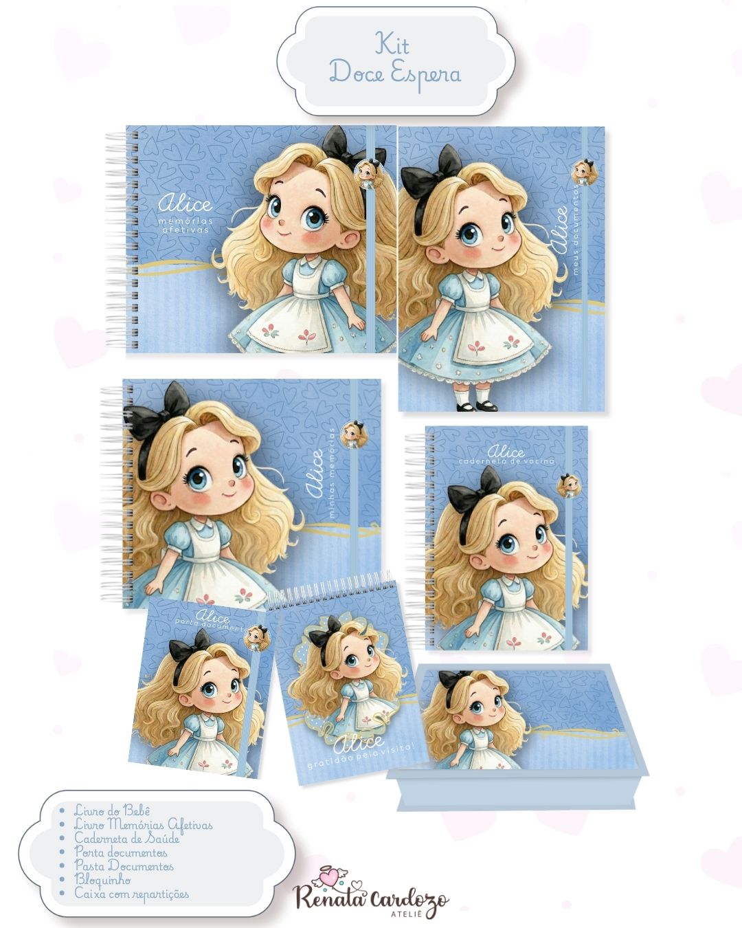 Inclui a Pasta para documentos maiores (certidões), o Mini Porta Documentos para o dia a dia e um Bloquinho A6 para anotações rápidas e cheias de amor.