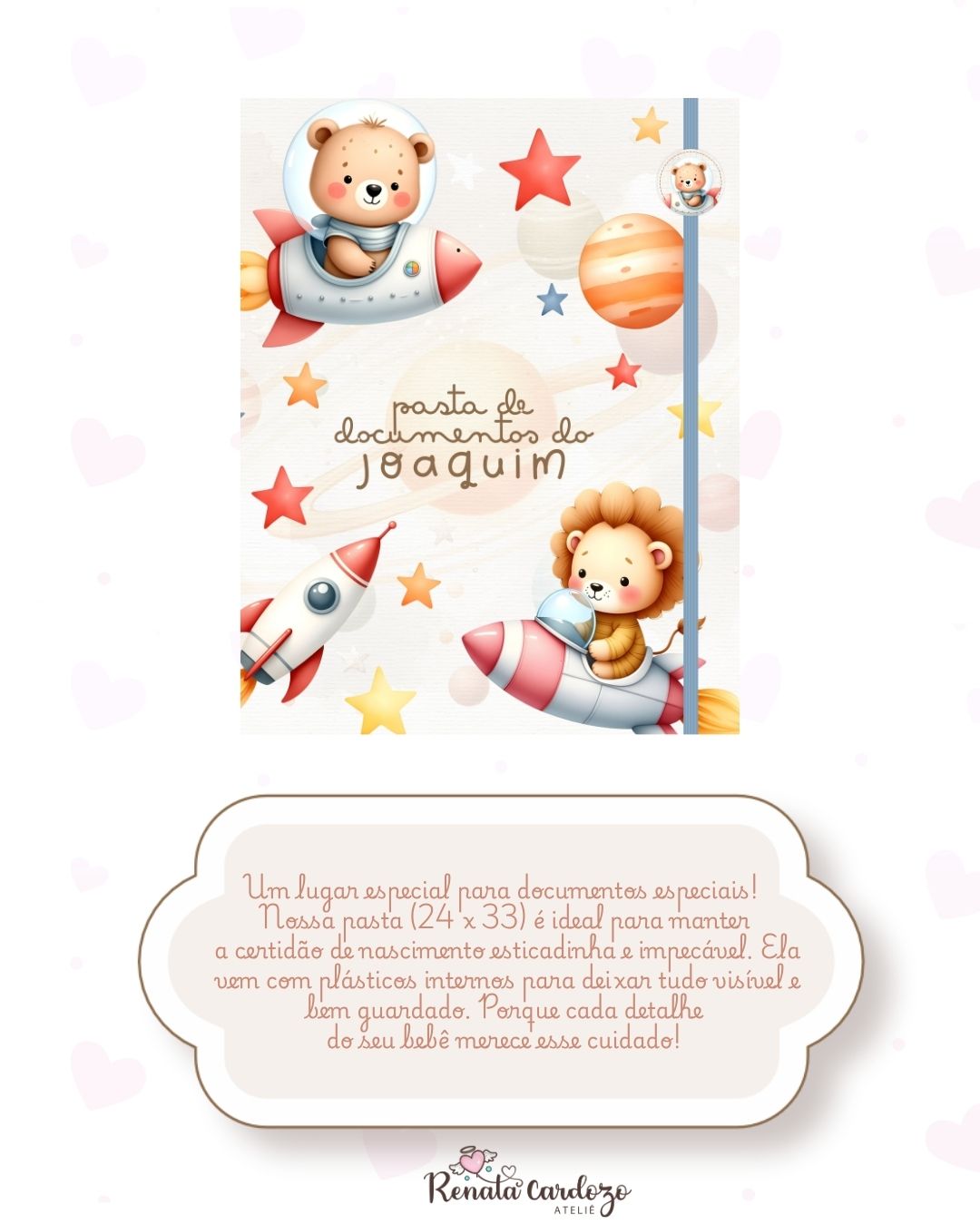 Inclui a Pasta para documentos maiores (certidões), o Mini Porta Documentos para o dia a dia e um Bloquinho A6 para anotações rápidas e cheias de amor.